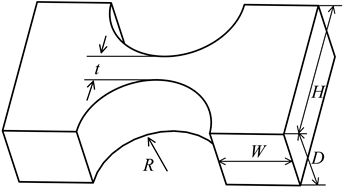 Compliant mechanisms are composed of several notch flexure hinges. These hinges are derived by drilling or milling two closely spaced holes, forming a certain cross-section cutout [18] [19]. For a circular flexure hinge, its cross-section is a circle, coupled with different main parameters. And its structure and the corresponding parameters can be illustrated in Figure 1, including the hinge thickness t, the hinge radius R, the rigid beam width W, the total height H, and the total depth D.