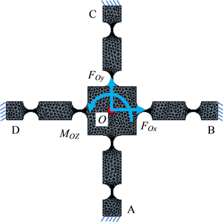 The main compliances (the axial compliance Cx-Fx, shear compliance Cy-Fy, and bending compliance Cα-Mz) are first calculated by the proposed theoretical model and FEA, respectively. Considering the accuracy of FEA, it is used as a benchmark. All flexure hinges have equivalent geometrical parameters and material properties. In order to get a compact compliant stage coupled with the natural frequency more than 800 Hz, a compliant stage is developed. Its hinge thickness is equal or more than 1 mm to process easily. Its geometrical parameters and material properties are given as L = 10 mm,L1 = 15 mm,R = 5 mm, t = 1 mm, W = 5 mm, and D = 10 mm. As shown in Figure 5, a FEA model was generated using ANSYS 14.0. The rigid beams at the end of the limbs are fixed, including the surface A, surface B, surface C and surface D. In addition, the forces (Fox, Foy, Moz) are applied at point o. For similar mesh quality, the model with high mesh density has more elements and smaller simulation time steps, and thus increases calculation accuracy and computational costs, respectively. Thus, hexahedral meshes and appropriate mesh density are selected. There is a displacement output on point O, when imposing a force on the output platform.