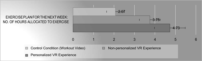Hypothesis 1 predicts that virtually experience losing weight in a fitness center will motivate people to engage in more exercises. We compared the means of hours participants intend to do physical activities in the next week among those in the two VR treatment conditions to those in the control condition who watched a workout video. All the analyses were conducted using the SPSS Statistics 24. Result of an independent samples t-test showed the main effect of the virtual experience on exercise intention was significant, t (40) = 3.16, p = 0.003. People who received the VR-based intervention were more motivated to engage in physical activities in the following week (M = 4.22, SE = 0.45) than people who only watched the video (M = 2.07, SE = 0.43). This effect was mainly driven by the difference between the self-avatar condition and the control condition (Mdifference = 2.66, SE = 0.80, p = 0.007). People who saw their own avatars getting fitter in the virtual fitness center planned to allocate the longest time to exercise (M = 4.73, SD = 2.69), followed by the other-avatar VR condition (M = 3.75, SD = 1.92). People who simply watched the workout video were least motivated to exercise in the next week (M = 2.07, SD = 1.66) (see Figure 2). Thus hypothesis 1 is supported.