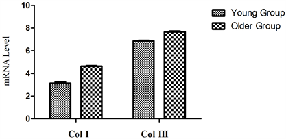 Real-time PCR was used to compare the mRNA expression of the target genes between the young group and the older group. Real-time PCR semi-quantitative analysis displayed that there was no significant difference between the two groups of type I and type III collagen α polypeptide chain mRNA (Figure 3). The Real-time quantitative result showed that the mRNA expression level of collagen type I α-chain in the older group was slightly higher than that of the young group (p = 0.05), but the difference was not statistically significant (Figure 4). Furthermore, there was no difference in mRNA expression level of collagen type III α-chain between two groups (Table 2).