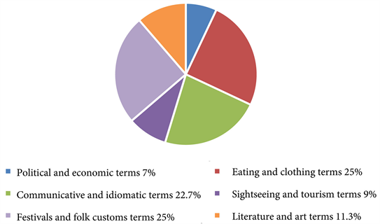 We can see from Table 1 and Figure 1 that the eating and clothing terms and the festivals and folk customs terms account for the first two largest proportion and the political and economic terms and the sightseeing and tourism terms account for a smaller proportion in the Chinese Language I.