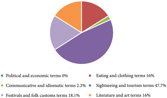 Compared with the Chinese Language I, the distribution proportion of various cultural vocabularies in the Chinese Language II is quite different (Figure 2). There are no political and economic terms, while the sightseeing and tourism terms account for almost a half, which indicates that cultural content in the Chinese Language II tends to introduce the sightseeing and tourism in China