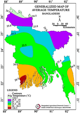 Precipitation variability in space and time is one of the most relevant and dominant characteristics of the climate of Bangladesh. The generalized maps of average rainfall (in mm) and average temperature (in ˚C) are shown in Figure 3(a) and Figure 3(b), respectively to depict the baseline climate scenarios in Bangladesh. Both the figures have been derived using 1948-2016 Bangladesh Agricultural Research Council (BARC) weather station data under BARC/UNDP/FAO GIS Project (BGD/95/006). More than 75% precipitation in Bangladesh occurs in monsoon. During the early part of the pre-monsoon, a narrow zone of air mass discontinuity lies across the country that extends from the south-west to the north-east. This discontinuity lies between the hot dry air coming from the upper Gangetic plain and the warm moist air coming from the Bay of Bengal (BB).