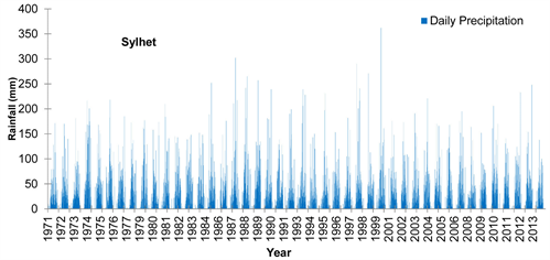 Figure 4. Daily precipitation trend (1971-2014) at Sylhet meteorological station.