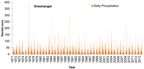 Figure 5 shows the daily precipitation trend in Sreemangal (1971-2014) with extreme precipitations in 1974, 1976, 1977, 1993, 1988, 1990, 2000, 2001, 2002, and 2004. Due to extreme precipitation in 1974 and 1988, there occurred huge flooding in Bangladesh. The highest pick of precipitation was found in 1976 (514 mm), 1984 (313 mm), 1990 (296 mm) and 2009 (328 mm).