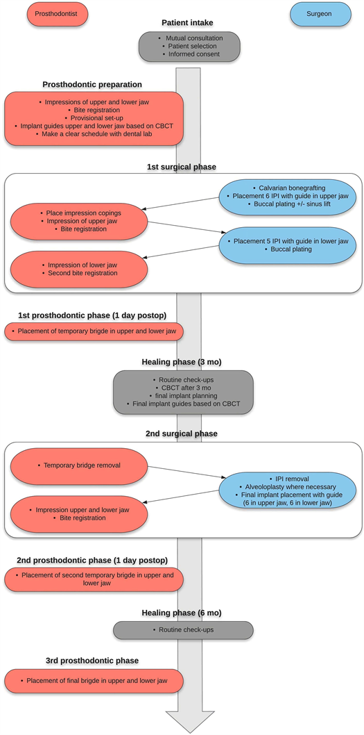 The suitable patient is edentulous with insufficient bone volumes (Cawood and Howell [8] class IV to VI) to allow implant placement or has a terminal dentition with a high aesthetic wish and a strong desire to avoid wearing removable prostheses. After proper diagnosis including radiologic imaging, a treatment plan is devised. The patient receives extensive information explaining all necessary steps, procedures, complications and associated costs. After obtaining an informed consent, the process is initiated. Figure 1 shows a flowchart of the complete process. In the prosthodontic preparation phase, casts of the upper and lower jaw are fabricated by means of an intraoral scan (Trios 3, 3Shape, Copenhagen, Denmark). The data is sent to the dental lab where a provisional setup is made in close communication with the prosthodontist. Clear collaboration between dentist and dental lab is of utmost importance regarding occlusion, vertical relation between upper and lower jaw, teeth alignment and aesthetics. All of
