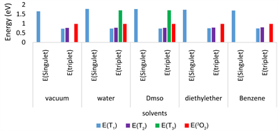 The determination of the six lowest energy singlet and triplet states was performed by the TDDFT method in vacuum and at the B3LYP/LANL2DZ level. As the photochemical reactions of this complex are carried out in biological milieu, it seems justified to evaluate the impact of the solvent on these triplet states. At this level, it should be noted that the solvents can be grouped into four categories which are: polar protic solvents, dipolar aprotic solvents, low-polar aprotic solvents and apolar aprotic solvents. In the coming work, we will use a sample of each of the above solvent types. The first of these solvents is water. It is a polar