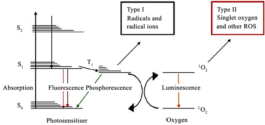 Photosensitization in photodynamic therapy can be understood through two mechanisms: in the mechanism I, the photosensitizer reacts directly with the target substrates such as DNA, RNA, and proteins. Whereas the mechanism II, the photosensitizer is assumed to cause damage to the target substrates via reactive oxygen species (ROS) created by an electron or energy transfer between the photosensitizer and molecular oxygen.