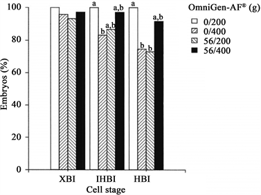 Table 2. Onset of expansion (XBl) and initiation of hatching (IHBl) and completion of hatching (HBl) in vitro for embryos recovered from cows fed 0 or 56 g OmniGen-AF® (0, 56) and superovulated with 200 or 400 mg FSH (200, 400).