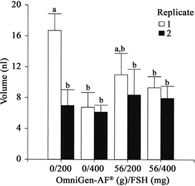 Figure 3. Embryonic volumes (means ± SE) determined at the last day of culture for embryos recovered from cows superovulated with 200 or 400 mg FSH and fed 0 or 56 g OmniGen-AF® in Replicates 1 and 2.