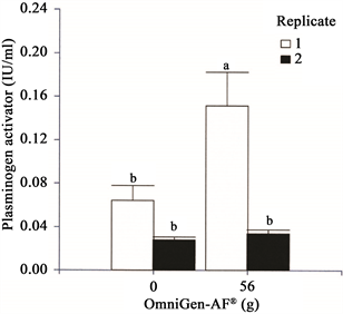 Figure 4. Plasminogen activator production (means ± SE) in vitro by embryos recovered from cows fed 0 or 56 g OmniGen-AF® in Replicates 1 and 2.