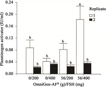 Figure 5. Plasminogen activator production (means ± SE) in vitro by embryos recovered from cows superovulated with 200 or 400 mg FSH and fed 0 or 56 g OmniGen-AF® in Replicates 1 and 2.