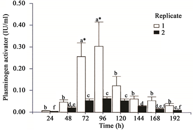 (P < 0.05) was measured during 72 - 120 h of culture and production was greater (P < 0.05) by embryos recovered in Replicate 1 at 48 - 192 h compared to Replicate 2 (Figure 6).