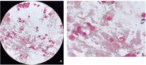 Figure 2. Gram strain of tracheal secretion showing numerous polymorphonuclear cells with gram positive staining organism, under 100× microscope (A). Higher magnification view showing gram positive beaded filamentous branching organism (B).