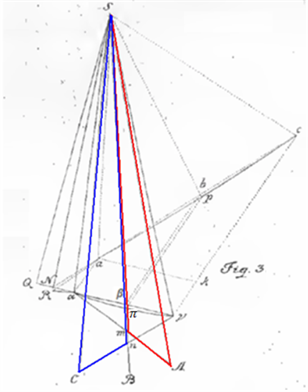 Now that the segment BS shows the distance of the Comet to the Sun in the intermediate observation, may be drawn the lines Aα, and Cγ which designate the Comet’s distances to the Earth in the first and last observation, whose positions are to be determined such that