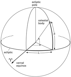 ). The coordinates are celestial (or ecliptic) longitude (λ) and celestial (or ecliptic) latitude (β).