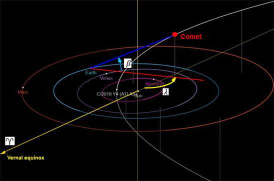 Figure 5. The orbit of Comet C/2019 Y4 ATLAS, shown near perihelion, with indications of the ecliptic geocentric longitude (λ) and the ecliptic geocentric latitude (β). Credit: NASA/JPL. Adapted from: https://www.universetoday.com/145036/comet-y4-atlas-in-outburst-first-good-comet-for-2020/.
