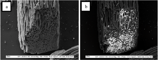 Figure 5. Morphology of CAA carbon before and after adsorption of Pb(II). (a) Before adsorption of Pb(II); (b) After adsorption of Pb(II).