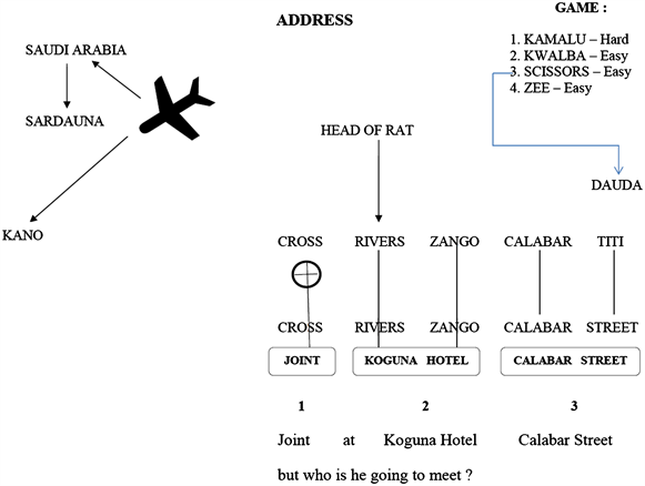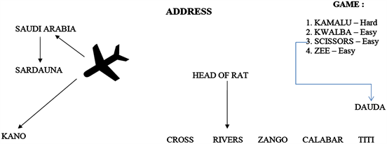 In the Hausa film Basaja, the main character Jabir goes through this medium to give instructions to his fellow the so-called Sardauna. But a secret agent broke into his hidden record house, found his secret file where he was instructing Sardauna but through coded message from his Description Board as materialized in Figure 1 as follows: Put in form of a figure where we can read on the left the name of the main character next to him thats Sardauna who should fly from Saudi Arabia to Kano. On the right, he mentioned the names of all that are concerned by the operation to take place, Sardauna might or should come across/meet that are Kamalu, Kwalba, Scissors, and Zee where he even described the very first as hard and the others as easy; the address where Sardauna is supposed to go and look for another character in a coded form that is: Cross Rivers Zango Calabar Titi. Last mentioned was the name of Dauda who has gone to fetch Sardauna from the Airport, explained what’s on, where to find whoever is concerned and so.