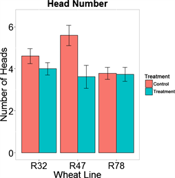 Figure 1. Relationship between head number, wheat line, and treatment. Wheat lines: resistant 25R32 (R32), susceptible Pioneer variety 25R47 (R47), and tolerant Pioneer variety 25R78 (R78) when infested (blue) and uninfested (pink). Error bars represent standard errors of each sample.