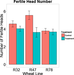 Figure 2. Relationship between fertile head number, wheat line, and treatment. Wheat lines: resistant 25R32 (R32), susceptible Pioneer variety 25R47 (R47), and tolerant Pioneer variety 25R78 (R78) when infested (blue) and uninfested (pink). Error bars represent standard errors of each sample.