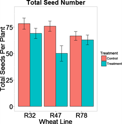 Figure 4. Relationship between total seed number per plant, wheat line, and treatment. Wheat lines: resistant 25R32 (R32), susceptible Pioneer variety 25R47 (R47), and tolerant Pioneer variety 25R78 (R78) when infested (blue) and uninfested (pink). Error bars represent standard errors of each sample.