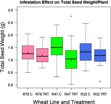 Figure 5. Relationship between the total seed weight per plant, wheat line, and treatment. Treatments where total seed weight per plant means differ significantly (P < 0.05) from their corresponding controls are indicated by a black asterisk. The box plot highlights the sample mean (red dot), median (thick dark line), first and third quartiles (lower and upper edges), and minimum and maximum (lower and upper range bars). Possible outliers in a sample are indicated by the open circles.