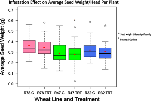 Figure 7. Relationship between the average seed weight per plant, wheat line, and treatment. Treatments where average seed weights per plant means differ significantly (P < 0.05) from their corresponding controls are indicated by a black asterisk. The box plot highlights the sample mean (red dot), median (thick dark line), first and third quartiles (lower and upper edges), and minimum and maximum (lower and upper range bars). Possible outliers in a sample are indicated by the open circles.