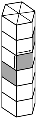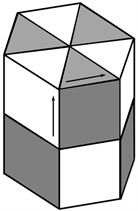 In further analysis, it was taken into account that the hexagonal prism of the circular quantum of the space of the Universe is composed of 6 trihedral prisms of elementary quanta of space. It was also taken into account that their three-sided shape can be associated with quarks. Therefore, a hexahedral prism of a circular quantum of space can be formed by 3 composition elements of real quark with a common top in the center of the prism, with the formation of 3 composition elements of virtual quark between them (Figure 7).