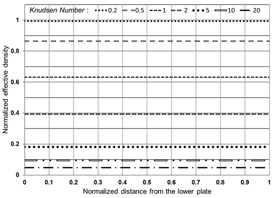 We intentionally provided a graphical interpretation of Equation (54) to highlight that the normalized effective density is constant within the gas space and depends only on the Knudsen number. As the Knudsen number’s value increases from 0.2 to 20, the effective normalized density decreases from 1 to 0.048.