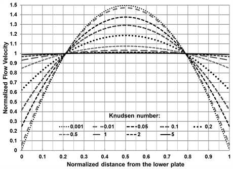 , kinetic effects are limited to the vicinity of the walls, one can obtain solutions of the linearized Boltzmann equation by superposing a Navier-Stokes solution with a kinetic boundary (Knudsen) layer correction, where the latter is significant only up to distances of the order of one mean free path from the wall”. However, Guo et al. [3] extended the applicability of the Navier-Stokes equations to much higher Knudsen numbers (up to about 80, see Figure 4 in [3] ). They claimed that because the data of their extended Navier-Stokes constitution (ENSC) model “agree well with the experimental data in the entire range of δ, and the Knudsen minimum in the flux is captured successfully”, their model of the effective viscosity is valid. Still, it is difficult to imagine the applicability of the Navier-Stokes equations, which are designed to describe fluid flow in the infinite small volume, to the rarefied gas media having a gas-particle density low as one gas particle per 10 - 80 distances between the walls. It is also disputed if such behavior of the effective MFP near the wall is physical or not [15] ”.