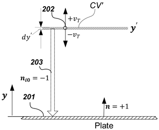 For clarity and simplicity of quantitative evaluation, we provide below the analysis of a one-dimensional gas system. Figure 2 is a planar view of the geometry of a one-dimensional gas system for determining the total rate of collisions per unit area on the planar plate 201 from the gas volume. The ballistic particles have straight-line trajectories toward and outward the plate in the system with no gravitational force. Here again, we consider an incompressible gas at the uniform temperature in a steady-state condition. In a space filled with the incompressible gas over the being at rest plate 201 having a directional vector