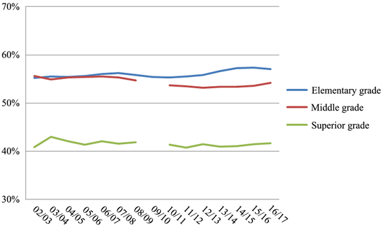 In a first phase, the data provided by the Cultural Statistics Yearbook (2002 to 2018) have been studied. Figure 1 summarizes the representation of women throughout different school years and different grades.
