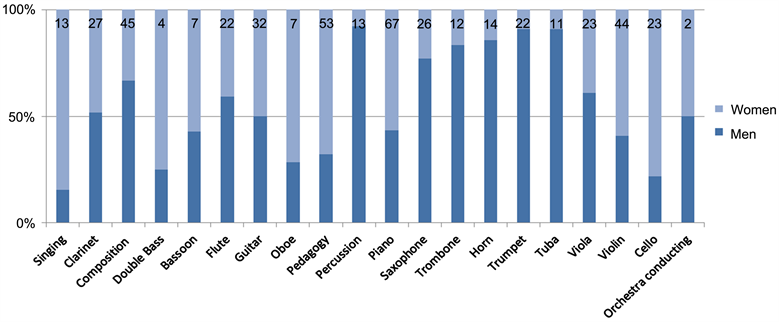 In this standardized graph, the percentage of men and women per instrument is shown together with the number of students per specialty (above the bar). It can be seen that some instruments are highly conditioned by gender. This is the case of brass instruments (Trombone, Trumpet, Trumpet and Tuba) and percussion, which are studied mostly by men, and to a lesser degree, the Composition specialty. On the other hand, women have a greater presence in specialties such as Singing, Cello, Double Bass and Oboe. In addition, there is a group with more balance between sexes, such as Clarinet, Bassoon, Flute, Guitar, Piano, Violin, Viola and Orchestra Conducting.