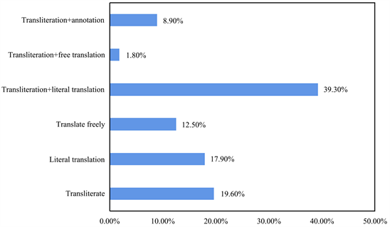 It can be seen from the above figure that “transliteration + literal translation” accounts for the largest proportion, exceeding 1/3. “Transliteration”, “literal translation” and “free translation” account for the same proportion. The translation strategies of “transliteration + free translation” and “transliteration + annotation” are seldom used.