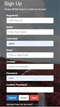 Figure 9 shows the registration part. In the registration part, there are 7 columns (Register ID, Name, Username, Email, Contact, Password, Confirm password). Here, the phone number and email must be unique. For registration user have to fill up this page, first of all user give the register ID, then write the full name, username, here email have to be verified email then contact number, password and confirm password. From this page user can reset their information also.