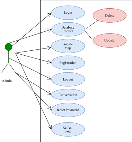 Figure 6 contains the admin use case diagram of the system. It shows what types of process in the system are done by an admin. Here, admins can log in to the system after registration. Admin can control the database like delete something or update something from the database. Also, they can see the Google map and, using the conversation system, they can easily contact others. Admin also reset the password and refresh the page.