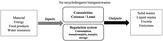 In the cities, these resources (inputs) enter in the “regulation system” refers here to the metabolic consumption of inputs, transformation, transfer or storage. For example, the food products were consumed by human and animal or transformed by the industries. Water from the rains, River, Lake, lagoon and Atlantic Ocean entered in the Cotonou and Lomé urban system, in connection to the shallow unconfined groundwater. Otherwise, water, especially from the wells and the national network is used for washing, bathing, laundry, cleaning dishes, gardening, household cleaning and occasionally for cooking/drinking. These metabolic mechanisms (production, transformation and consumption) generated waste in different forms such as wastewater, black water (urine and faeces), greywater (effluent from shower, washing, hand basin, dishwasher and kitchen), solid waste (plastic bags, metal packaging, residues of crop products, etc.), human and animal faeces, etc.