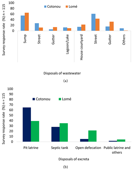 Approximately 65% of people in Cotonou and 70% in Lomé see a relationship between poor health and sanitation problems (59% and 52%), household solid waste (51% and 40%) and wastewater management (30% and 36%). Citizens’ behaviors on solid waste management are burying, discharge into gutters, bridging swamps, burning, and low uptake of sanitation services. Also, wastewater and excreta management in Cotonou and in Lomé are inappropriate (Figure 3) and compromised well water bacteriological quality and its availability.