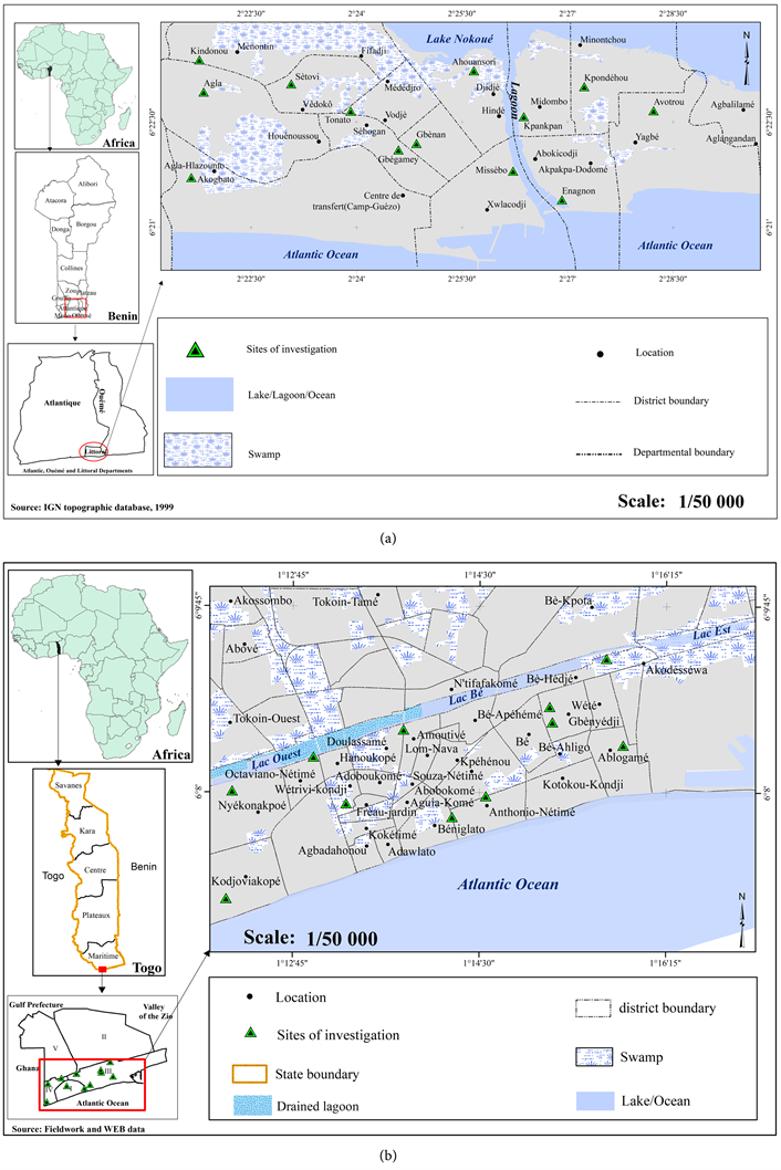 Figure 1. Geographical location of the cities of Cotonou (a) and Lomé (b) and domestic well water sampling sites.