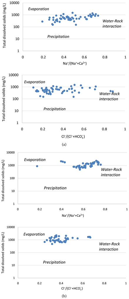 The major factors controlling the hydrogeochemical compositions [13] [34] had been distinguish through Gibbs diagram which basis is the ratios [Na+/(Ca2+ + Na+)] and [Cl−/(Cl− +