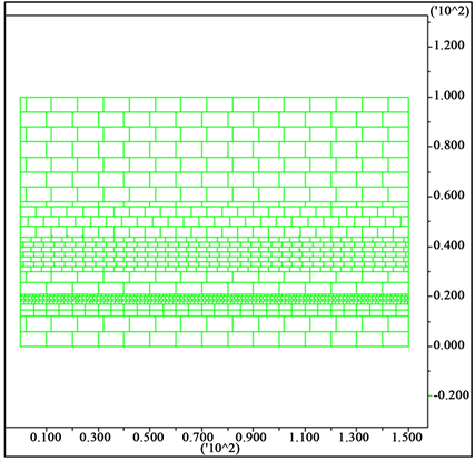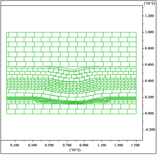 The development of water flowing fractured zone of 91105 working face was simulated by the software of UDEC. Taking into account of analysis purpose and the actual situation of working face, the length and height of the two-dimensional calculation model were set as 350 m × 90 m respectively in order to eliminate the effects of the stress boundary and the displacement boundary. The strata with similar properties were divided into the same group along the strike of the mining face, and the simulated geometric model of the working face was shown in Figure 2.