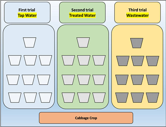 The experiment carried out under greenhouse conditions at Palestine Technical University (Kadoorie), Faculty of agricultural Science and Technology, Department of Environment and Sustainable Agriculture collaboration with Laboratory agriculture research center (Kadoorie). Cultivation of Cabbage crop started at 24 September 2019, the experiment components were three trials included 10 pots for each trials illustrated in Figure 2.