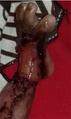 He is a male newborn, born to apparently healthy, first-degree consanguineous parents, a primigestprimipare mother who has had a poorly followed pregnancy to term, and a vaginal delivery. She was admitted on the second day of life on suspicion of early neonatal infection from the regional referral health center where he was born. The infectious anamnesis was negative. The newborn had been presenting skin lesions since birth, with the parents finding at d 2 of life of an unquantified fever. The entrance examination found a term newborn, hytrophic, with a weight of 1760 g (less than—2 DS of the reference curves), a height of 46 cm (in the average), a head circumference of 33 cm (in the average). The hemodynamic state was stable, with a fever at 38.6˚C, a skin recoloration time of less than three seconds, a normal heart rate of 160 beats/min, and a respiratory rate of 40 cycles/min. minimal respiratory distress with 97% oxygen saturation. There were post-bullous erosions at the outer face of the leg and right foot (Figure 1), an absence of skin extending from the back of the foot to the middle 1/3 of the thigh. The lesions were bilateral and symmetrical occupying almost all of both legs and the front faces of the thighs only a few islands of healthy skin persisted on both legs (Figure 2). This absence of skin was also noted on the outer side of the left and right hands with skin fragility and some flaccid bubbles (Figure 3). The edges of the lesion were sharp and the skin on the periphery had a normal color. The vascular network was clearly visible at the level of substance loss. The rest of the skin coating was normal. The integuments and mucous membranes were unremarkable. The nails were dystrophic. In front of this atypical clinical picture associating a lack of localized skin predominant in the lower limbs and a skin fragility, the histopathological examination in the bullous zone allowed to show a dermoepidermal cleavage evocating a bullous epidermolysis