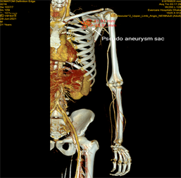 the upper limb prevents ischaemia even within the presence of proximal injuries [9] [11]. Angiogram is extremely helpful to determine the site of injury, screening for occult and associated vascular injuries, whether patients get benefit from endovascular intervention or not and most importantly for planning the surgical approach [11]. In current case we use CT angiogram to reveal the status of injury and affected limb circulation. Regarding management of penetrating SCA aneurysm, some recent studies showed use of SCA stent to close the opening between SCA and pseudoaneurysm not superior than surgical correction because there may remain high risk of infection in already formed pseudoaneurysm sac. Excision of that pseudoaneurysm is mandatory [12] [13]. In this reported case, the patient was not approached with endovascular management, as the patient was flown from a remote city of Bangladesh, where limited resources for endovascular management, and in our institute, we don’t routinely practice endovascular procedures for vascular injuries. As the entry wound was also tightly packed and there may presence of uncertainty of injuries our surgical team was decided to do open techniques for the surgical correction without delaying time. Surgical correction of a SCA pseudoaneurysm connecting with a normal SCA can be done with simple excision of pseudoaneurysmal sac without sacrificing the part of SCA either direct or vein patch closure of that opening with polypropylene suture. In some cases rarely excision of part of Subclavian artery may require with replacement by autogenous veins or prosthetic grafts to establishment for limb circulation [7] However, early preoperative pressure control of bleeding and surgical exposure of the subclavian and proximal axillary vascular injuries may challenge even the most experienced surgeon because major portions of these vessels are retroclavicular in position [10]. Although various types of surgical approaches have been described in different literature for the management of penetrating SCA injuries [9] [10] [14] but an adequate incision is most essential to take vascular control, identify the site of injured vessels and other associated injury and for correcting those injuries. Traditionally, for right subclavian artery injuries it has been taught that surgical approach should be with a midline sternotomy with a clavicular incision. However, recommendation for left-sided injuries is an anterolateral thoracotomy or “trap door” incision [10]. In our case, we used the combination of mini sternotomy upto 4 ICS and a left sided clavicular incision extending from sternoclavicular junction to left deltopectoral groove was used with disarticulation SCJ provides an excellent exposure to take adequate vascular control and to deal with injuries. With this approach we found minimal risk of per-operative bleeding as we take all proximal and distal vascular control and pseudoaneurysmal sac can remove totally and repair of vascular injury also easier. In this reported case we found transected SCA at its mid part without any long segment involvement, so repaired directly using polypropylene suture. In a study conducted on 50 surgically managed penetrating SCA injuries revealed, reported primary repair of the SCA was possible in more than half of their patients and among interposition grafting patients, 70% of patients were injured with gunshot wounds and 35% of stab wound and they reserved ligation for cases with delayed presentation, sepsis, critically ill and haemodynamically unstable patients needing damage control surgery [11]. There were no major postoperative complications in current case except postoperative limb oedema, which was transient and resolved with limb elevation. However literature revealed, a trap door incision is associated with excessive bleeding, severe postoperative pain, and respiratory complications [10]. There were no associated or residual brachial plexus injuries in current case. Regarding brachial plexus injuries studies mentioned earlier, were encountered in 12% of cases and neurological deficit remains the leading cause of morbidity of those case and they stated that the neurological deficit on presentation of some cases were results from compression of the nerves by a haematoma or an aneurysm and resolves after expedient surgical intervention [11].