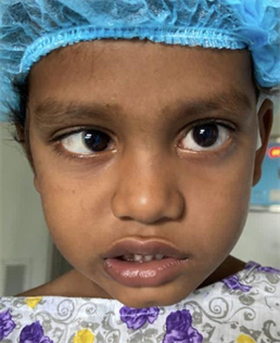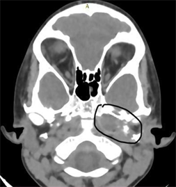 A 4-year-old boy came to our hospital with complaints of Ear ache, purulent discharge, bleeding from left ear since 1 month. Also noticed a mass in left ear since 20 days. He developed left facial paralysis since 1week and diplopia since 3 days. He was treated with antibiotics for 3 weeks elsewhere with no response instead his symptoms got worse after which he was asked to visit a higher centre. On physical examination, there was a polypoid, reddish and fragile mass that filled the external ear canal in the left side, facial nerve palsy (Figure 1(a)), Diplopia (Figure 1(b)) and there was foul smelling discharge from the ear canal. Biochemistry tests were normal. In CT Temporal Bone scan, soft tissue density was present in the mastoid and middle ear. The mass involved the external ear and projected from external auditory meatus. Permeative osteolytic destruction of petrous apex, left carotid canal (Figure 2). Reported as left acute otomastoiditis with petrous apicitis. MRI Brain was normal.