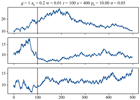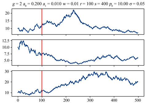 Figure 3. Three times stock price dynamic simulation generated by random walk (0 - 100) and model (12) (100 - 500).