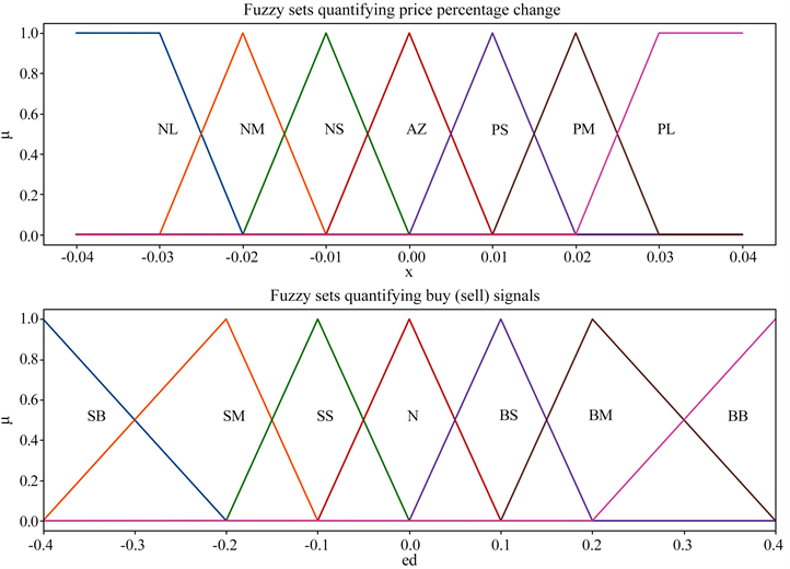 Let ed be the trading intensity, which is used to represent excess demand. Then the buying and selling signal corresponding to the change of stock price is represented by fuzzy sets, which can also be divided into seven fuzzy sets: Buy Small, Buy Medium, Buy Big, Neutral, Sell Small, Sell Medium and Sell Big. The membership functions corresponding to them are shown in Figure 1, and each fuzzy set can also be represented by a piece-wise function. For example, the membership function of the fuzzy set SM is