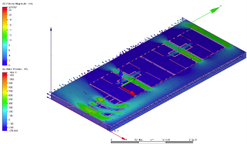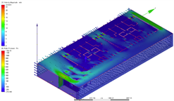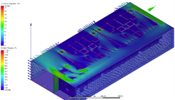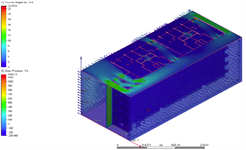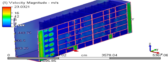 This section gives a simulation report on the room comfort and cross ventilation through well-annotated architectural massing designs and layouts. A summarized report on the room ventilation and velocity analysis is given below. In the simulation, all internal windows were shut and Wind speeds were set to 4.7mph (2.107 m/s). Result shows a peak wind speed of 4.7m/s, while for the condition where all windows were opened with equivalent parameters, a peak wind speed of about 5 - 4 m/s at a stabilized flow was seen. The application of wind speed of 4.7 mph was informed by the fact that we are operating at standard atmospheric temperature and pressure. Figure 8 depicts the vertical cross section of the building, showing areas where air circulation impacts the design. Finally, Figures 9-14 show the glyphs for cross ventilation of various floors.