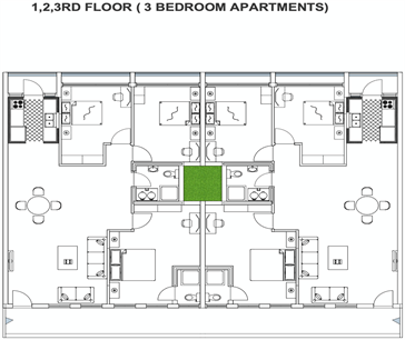 Vegetation and trees in particular, very effectively shade and reduce heat gain. This proposed greenery can be used with advantage to shade roof, walls and windows. Shading and evapotranspiration from trees can reduce surrounding air temperatures as much as 5˚C. In essence, this greenery in the layout of the buildings will enhance ventilation, provide a means to capture thermal mass. Also, to improve air quality, internal windows are installed on the walls of each room, except for the one bedroom self-contain of the 4th and 5th floor. This concept was adapted after series of simulations to enhance indoor natural circulation, and to complete a full cross ventilation cycle. This concept is shown in Figure 3.